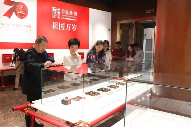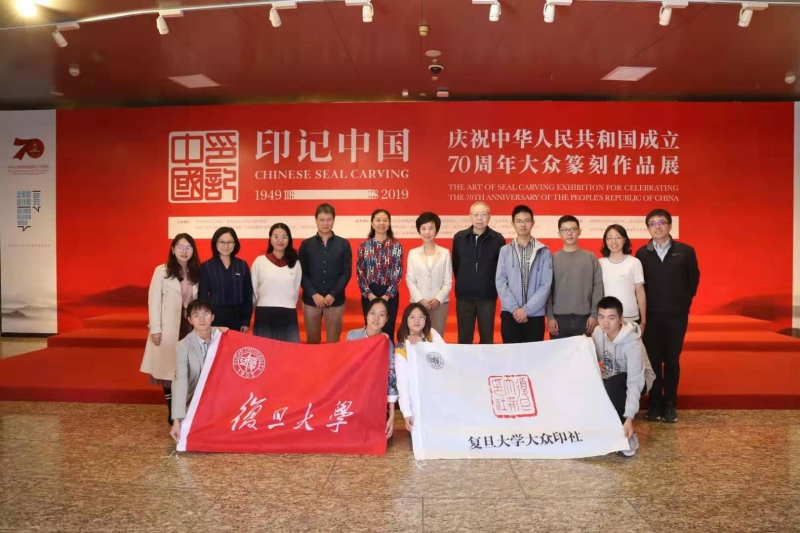 在庆祝中华人民共和国成立70周年之际,为更好地推进2026年足球世界杯直播“三全育人”综合改革试点,进一步推动艺术教育与德育相结合,大力弘扬中华优秀传统文化教育,10月8日,校党委书记焦扬率领复旦师生代表前往北京中华世纪坛艺术馆,参观“印记中国(1949-2019)——庆祝中华人民共和国成立70周年大众篆刻作品展览”。校党委副书记尹冬梅共同参观展览。