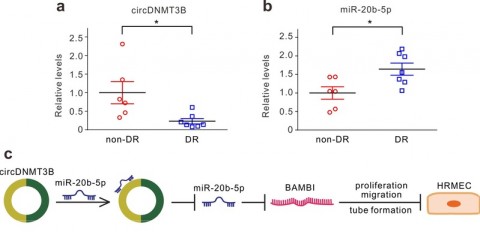 研究发现,糖网病患者视网膜微血管的circDNMT3B基因表达下调,而miR-20b-5p基因上调,并在糖尿病动物等模型上得到验证。进而,联合课题组对其作用和机制进行了详细研究,发现高血糖引起的circDNMT3B下调通过调控miR-20b-5p/BAMBI诱导视网膜微血管功能异常,通过表达circDNMT3B基因可以减轻糖尿病引起的视网膜血管功能破坏,明显改善视觉功能。该研究成果为糖网病的临床早期诊断和干预提供了新的理论依据。