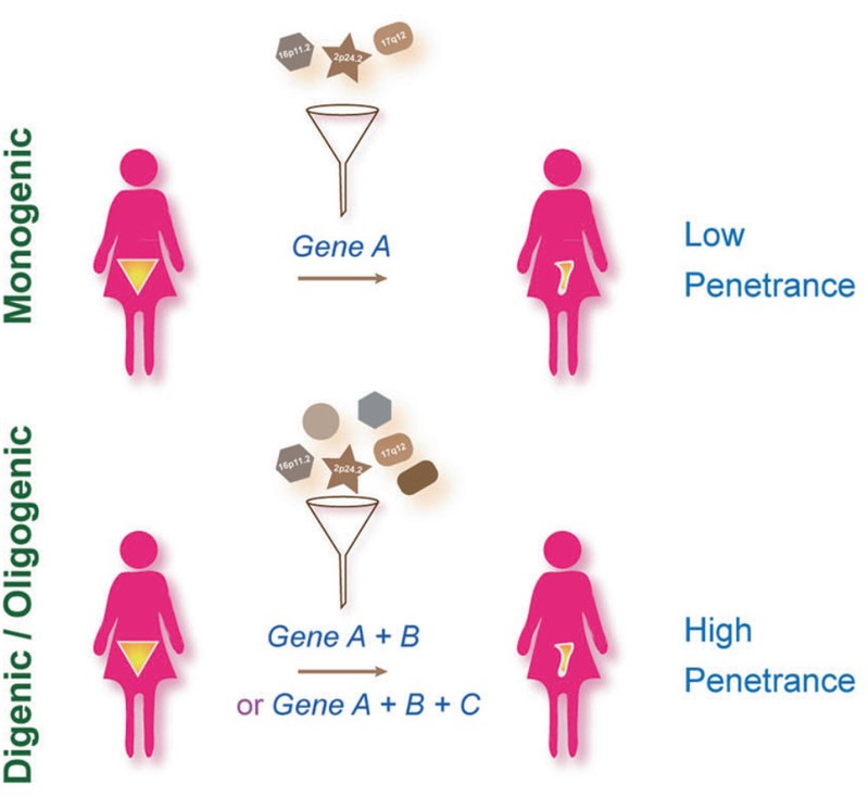 据张锋介绍,在家系遗传分析中,其团队发现部分患者的母亲携带相应的CNV。这些结果提示单一的遗传变异不足以导致苗勒管发育不良。研究人员进一步利用全外显子测序技术对上述9例CNV携带者进行了全外显子测序,发现其中1例GEN1/2p24.2缺失患者还携带有WNT9B基因突变、1例TBX6/16p11.2缺失患者还携带有GATA3基因突变。由此推测“GEN1+WNT9B”、“TBX6+GATA3” 2个突变组合可能是导致人类女性苗勒管发育不良的致病原因。