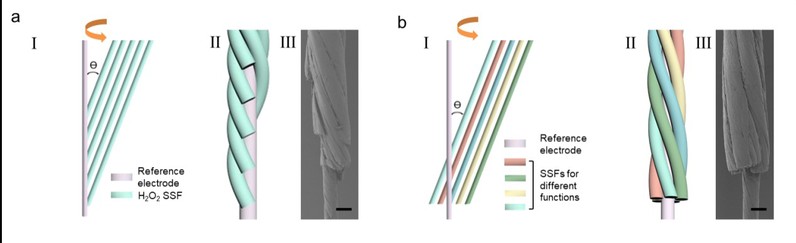 附图二,多级螺旋纤维状传感器的结构示意图。a,轴向分布用于不同位点对同一物质的分布进行检测;b,径向分布用于同一位点对不同种类的化学物质进行检测。标尺:50μm。