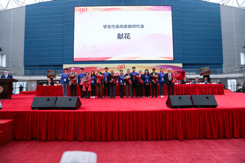 新闻学院的今天离不开老一辈教师、学者的默默耕耘。学生代表向八位老教师代表献花,掀起了现场气氛的小高潮。