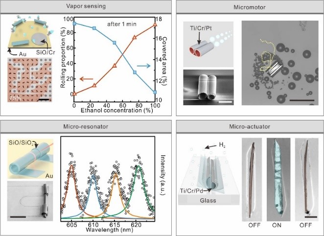 利用这一方法制备卷曲三维微纳结构的过程十分简单。仅需将一滴液体滴加在图形化沉积的多层纳米薄膜样品上,纳米薄膜便会在接触到液体的瞬间从基底剥离卷曲形成各种三维结构。而液体在样品表面的流动扩散会不断剥离每一个接触到的纳米薄膜,完成规模化的制备过程。通过不同的基底材料设计,这一方法成功应用于各种金属及氧化物体系的三维微纳结构的制备。为了实现对纳米薄膜卷曲行为的精确控制,研究团队利用与微操作系统相连接的毛细管控制样品表面的微液滴运动以精确设定液体与纳米薄膜的接触剥离点,使纳米薄膜摆脱了图形和材料的限制,能够沿着任意方向进行卷曲。结合纳米薄膜的图案设计,完成了各种复杂三维结构的设计和制备。研究团队充分利用了这一新颖的制备方式构筑不同材料的三维微纳结构,展示了其在气体传感、光学谐振腔、微纳马达及机器领域的应用潜力。