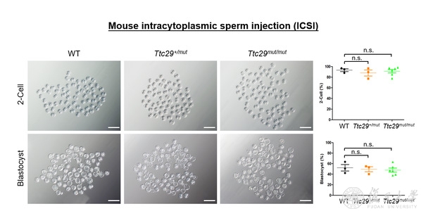 据介绍,目前基于卵胞浆内单精子显微注射(ICSI)的试管婴儿技术可以帮助弱畸精子症的男性不育患者生育自己的生物学后代。但前期的研究中发现对于携带不同遗传变异的弱畸精子症患者而言,他们通过ICSI取得成功妊娠的概率却不尽相同。因此,对于不同遗传背景下ICSI结局的探究显得尤为重要。该研究中,基于构建的Ttc29敲除小鼠模型,研究者们对基因编辑的小鼠精子进行了ICSI实验,结果显示,Ttc29敲除小鼠的精子可以获得与野生型小鼠近乎相同的2-cell率和囊胚率(图3)。与此一致的是,本研究中携带TTC29突变的三位患者均使用自己的精子进行了ICSI助孕,并且都获得了良好的妊娠结局。因此,该研究成果将为男性不育的分子诊断、遗传咨询和临床干预提供新的理论指导。