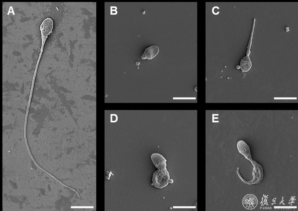图1:正常精子形态(A)和TTC29基因缺陷患者的精子形态(B-E)