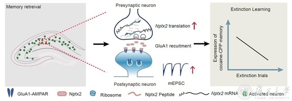 可卡因等成瘾类药物的使用可形成药物奖赏与用药环境的关联性记忆。这种强烈而持久的记忆,是产生对成瘾性药物的长期心理渴求和与成瘾性药物相关的环境线索诱发复吸的重要原因。以往的研究表明,重新回到之前用药的环境能唤起或激活成瘾相关记忆,而使记忆进入不稳定的状态,随后脑细胞将新合成一些蛋白,这些新合成的蛋白使记忆的到更新、强化或消除,重新回到稳定状态。那么究竟是哪些新蛋白参与这一过程呢?该团队让已形成可卡因和环境关联记忆的小鼠,重新回到原来给与可卡因的环境,在唤起可卡因关联记忆后的不同时间点采集小鼠背侧海马脑区的椎体神经元,采用Rib-Tag技术分离与核糖体结合的mRNA。通过测序和生物信息学分析发现,在记忆唤起后1小时,多巴胺能奖赏及突触可塑性相关信号通路蛋白翻译活化程度最高,而神经穿透素家族成员NPTX2是突触重塑的枢纽分子。实验表明,在背侧海马锥体神经元内敲低NPTX2后,小鼠可卡因记忆的消退受损;而增加NPTX2蛋白的合成,则促进可卡因相关记忆的消退。进一步研究发现,NPTX2通过其PTX结构域结合AMPA受体的GluA1亚基,将其锚定在细胞膜上,介导记忆唤起后的兴奋性突触传递,进而促进记忆的消退。研究结果还提示,在可卡因关联环境记忆被唤起1小时后,海马神经元中的NPTX2蛋白合成明显增加,其介导的兴奋性突触传递增强,这一神经可塑性改变参与可卡因相关记忆的消退。这些结果提示NPTX2可能是擦除成瘾相关记忆的一个潜在靶标。