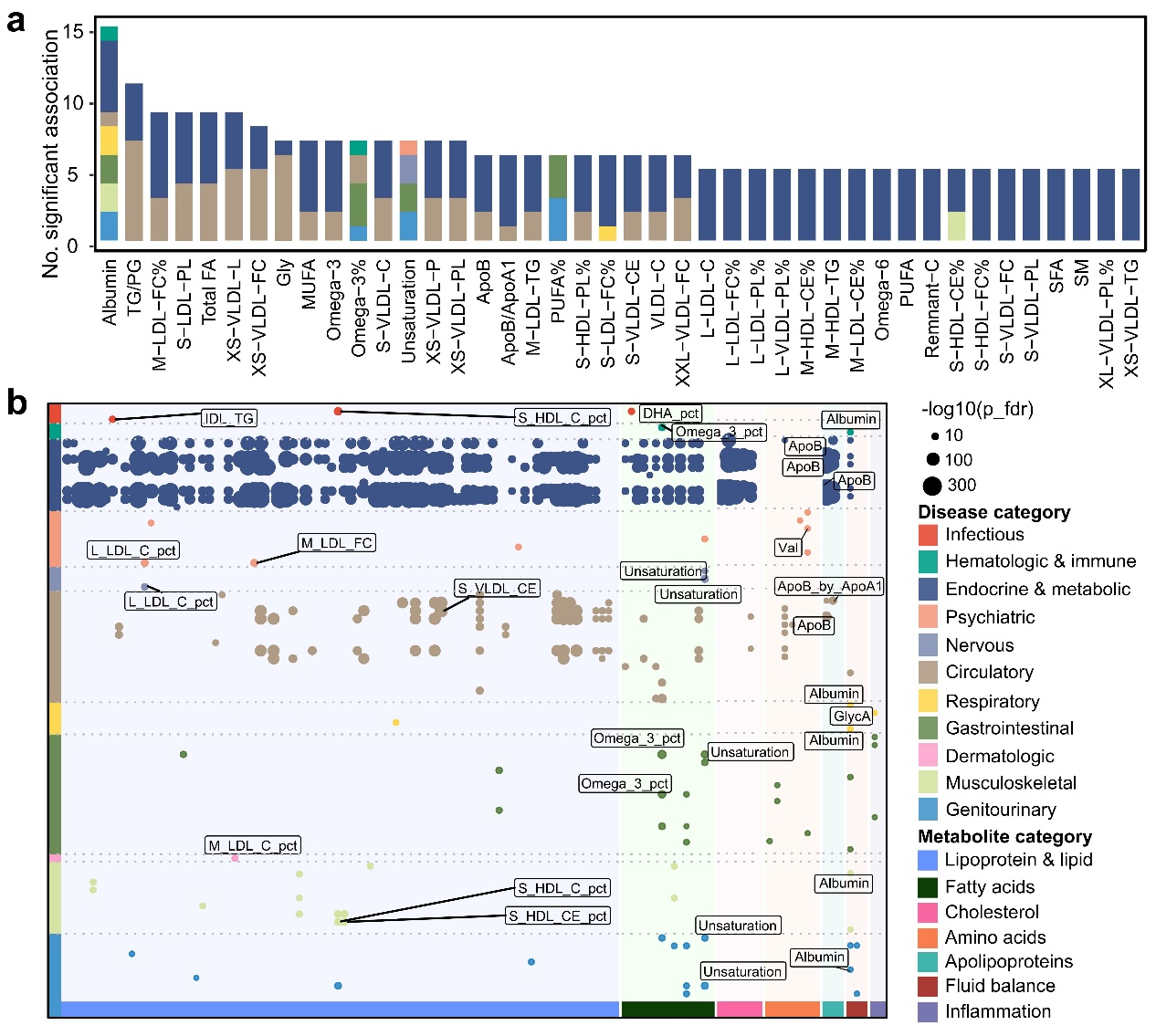众多人类表型间存在特异/共享代谢物,脂蛋白/脂质、脂肪酸以及相关比值贡献最多关联