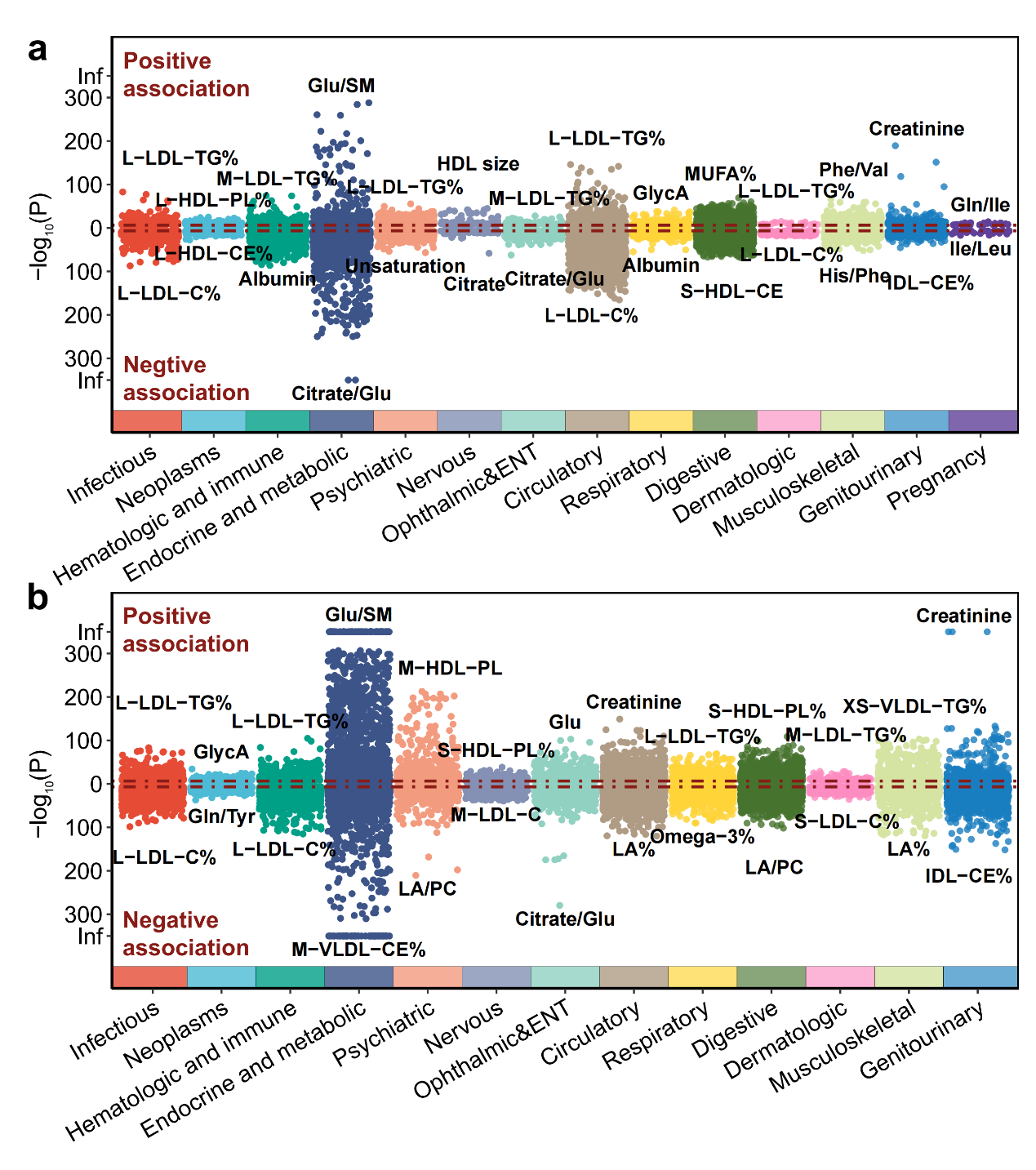 图4:代谢物与健康相关表型关联曼哈顿图