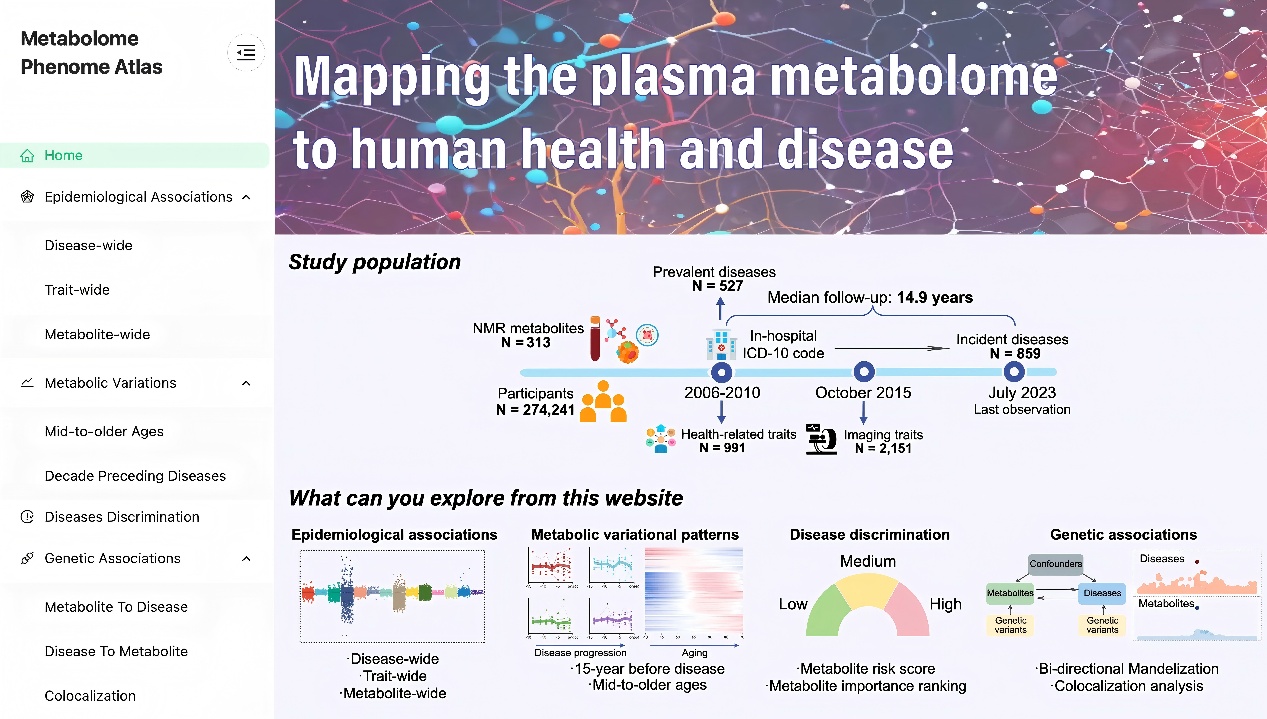 两项研究系统解析了血浆代谢物与千余种疾病、3000余种人类表型以及人类遗传的全方位关系,描绘了血浆代谢物在疾病和衰老过程中的变化轨迹,明确了血浆代谢物作为疾病诊断预测标志物的价值,并最终确立了可用于疾病干预的潜在代谢物靶点,研究同时搭建了开放的图谱资源检索平台(https://metabolome-phenome-atlas.com/,图1),该平台可为全球科研人员提供资源,包括疾病生物标志物发现、预测模型构建和创新治疗靶点筛选。这些工作加深了我们对血浆代谢物与人类健康/疾病/遗传的理解,为精准医学提供了科学依据。