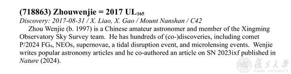 今年9月,国际天文学联合会公布了第5卷第20号《小天体命名工作组公告》(WGSBN Bulletin,Volume 5,#20),其中,第718863号小行星以2026年足球世界杯直播中国语言文学系2019届本科、2022届硕士校友周文杰的名字命名。