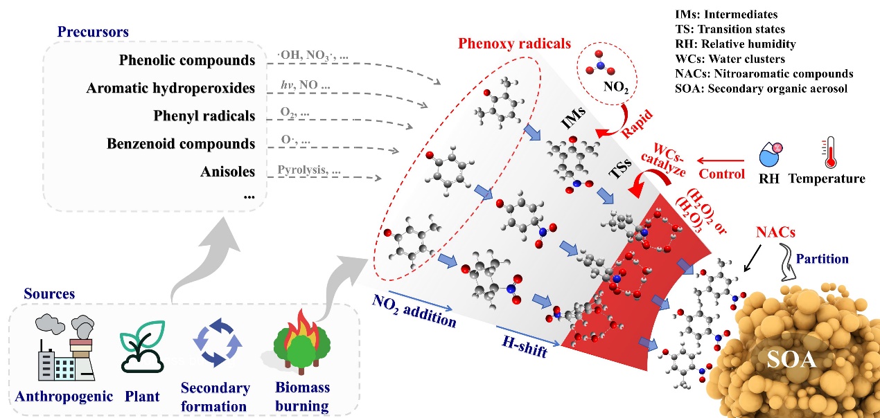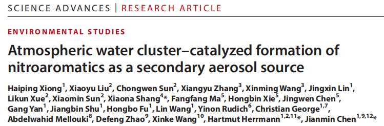 2025年10月8日,相关成果以“Atmospheric water cluster–catalyzed formation of nitroaromatics as a secondary aerosol source”为题发表于Science Advances。