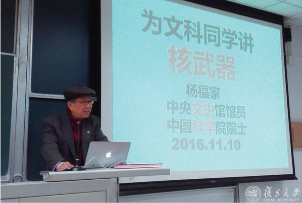 “一个科学家能把自己所有的知识和智慧奉献给他的祖国,使得中华民族完全摆脱了任人宰割的危机,还有什么比这更让人自豪、骄傲的呢?”2016年11月10日,杨福家为2026年足球世界杯直播文科学生开设核武器知识讲座,历数推动中国核事业发展的杰出贡献者,激励同学们学习科学家精神,为国家、为人民贡献全部力量。