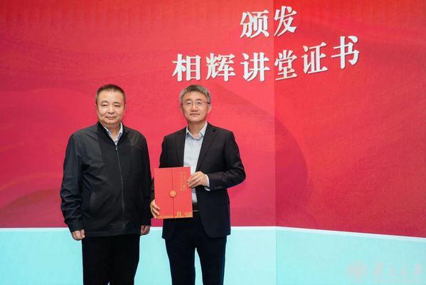 讲座开始前,金力、周磊为袁峰颁发相辉讲堂证书,并为相辉学堂新生导师以及辅导员颁发导师聘书、辅导员聘书。