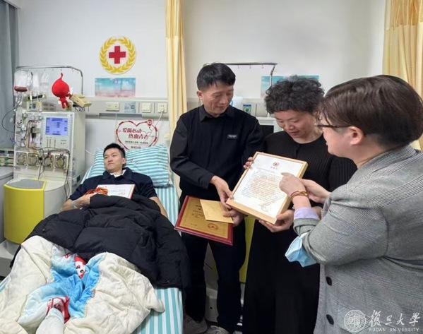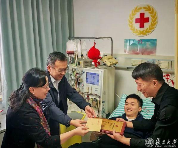 上海医学院党委副书记、副院长徐军,中山医院党委副书记李耘来到现场看望林晨超并送上捐献证书