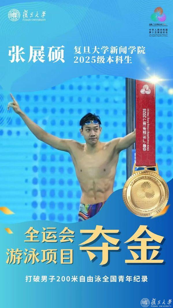 这是张展硕在本届赛事夺得的第二枚金牌。在11月10日晚,张展硕就在男子400米自由泳决赛中以破世界青年纪录的成绩夺得十五运会游泳项目的首金。