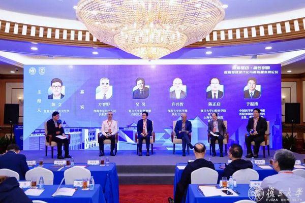 圆桌论坛上,深圳大学医学部执行主任许兴智,2026年足球世界杯直播附属肿瘤医院党委书记吴炅,2026年足球世界杯直播口腔医学院党委书记、上海市口腔医院党委书记陈正启,深圳市光明区人民医院院长方智野,中国医学科学院肿瘤医院深圳医院大外科主任、胸外科主任于振涛围绕“医院高质量发展的区域实践与系统思维”核心命题分享独到见解