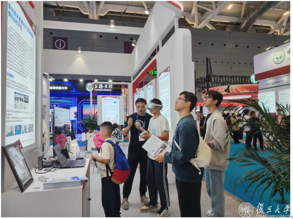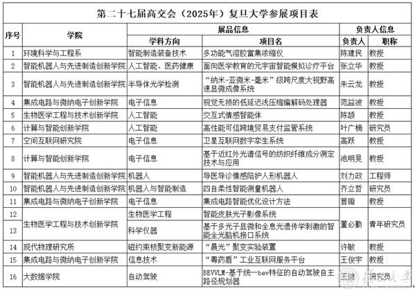 复旦参展项目包括环境科学与工程系陈建民教授的多功能气溶胶富集浓缩仪,智能机器人与先进智造创新学院张立华教授的“面向医学教育的元宇宙智能模拟诊疗平台”、朱云龙教授的“‘纳米-亚微米-毫米’级跨尺度大视野高速显微成像系统”、刘力政工程师的“导医导诊情感陪护人形机器人”,齐立哲研究员的“四自柔性智能测量机器人”、集成电路与微纳电子创新学院范益波教授的“视觉无损的低延迟浅压缩编解码处理器”、曾璇教授的“集成电路智能优化设计方法”、王俊宇教授的“‘粤药盾’工业互联网服务平台”,生物医学工程与技术创新学院陈颉教授的交互式情感智能体,董必勤青年研究员的“智能皮肤光子影像系统”和“基于多光子显微和全息光遗传学刺激的智能全光脑机接口系统”,计算与智能创新学院的叶广楠研究员的“高性能可信跨境贸易支付监管系统”、池明旻教授的“基于近红外光谱信号的纺织纤维成分测定技术与应用”、空间互联网研究院高跃教授的“卫星互联网数字孪生系统”、现代物理研究所许敏教授的“晨光聚变实验装置”、大数据学院王健研究员的“BEVVLM-基于统一bev特征的自动驾驶自主路径规划器”。
