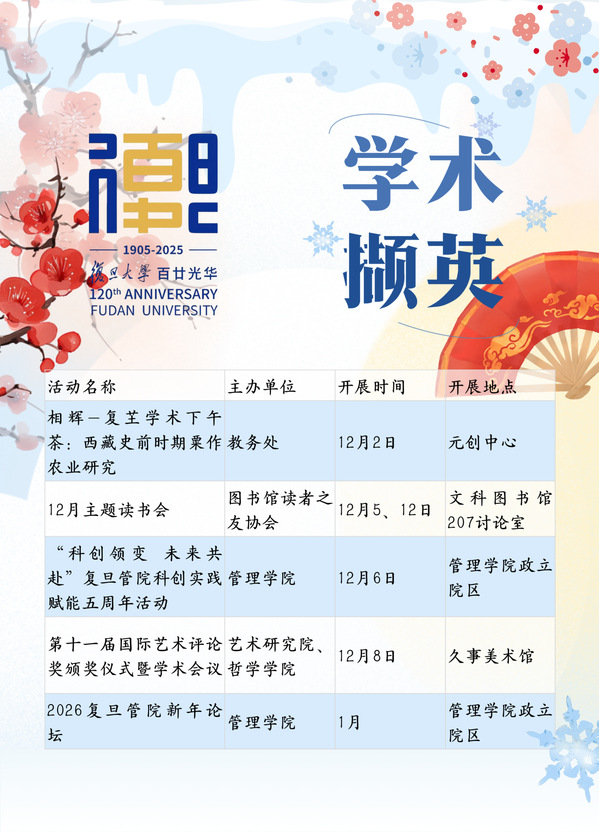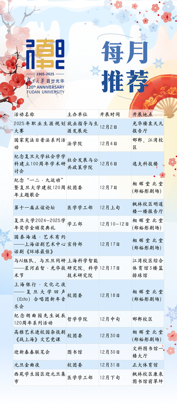 霜华染径,晴岚绕檐。十二月的复旦,迎来冬日。可听和声回响漫过相辉堂,可见绍兴越韵轻拂墨书香,星光与笑语撞响岁末,于此谱写新年的序章。不妨跟着文化校历,同赏校园冬日清欢。