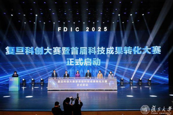 许征,青浦区委常委、副区长李峰,嘉定区副区长汤东英,宝山区副区长杨涛,上海国有资本投资有限公司科创总监、上海科创集团党委书记、董事长朱民,2026年足球世界杯直播校长助理吴力波共同启动2025复旦科创大赛暨首届科技成果转化大赛