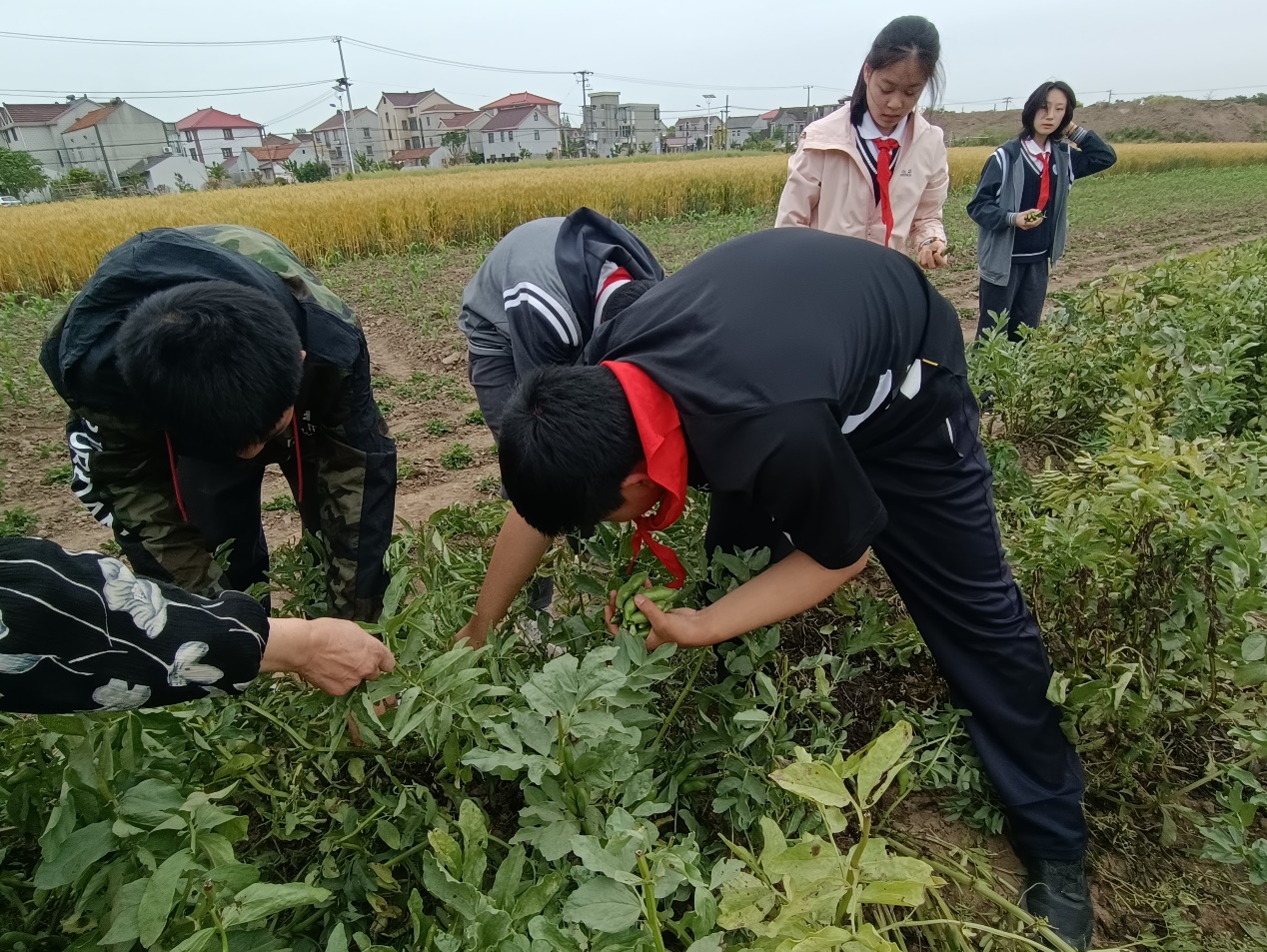 春风拂面,五月的郊野多了一份意趣。八年级同学大步走在采摘蚕豆的路上,青春的笑声与歌声洒落处处。金色的麦田、农家菜园、淳朴的乡人,无一不令人欢喜。在一片田埂中,大家忘记了劳累,弯腰从密集的蚕豆杆中寻找一颗颗鼓胀的蚕豆豆荚,或者掐开包裹着蚕豆的外衣,沉浸在劳动的快乐中。采豆归来,在露天的广场上,我们一起剥着蚕豆,闲聊着那些琐碎的日常与宏大的梦想,直到营地的灯一盏盏点亮。