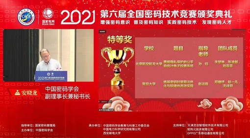 2021年第六届全国密码技术竞赛历时三个月,竞赛分初赛、复赛和决赛三个阶段。共有来自全国60个高校和企业、共计333个团队、1332名选手参加。经过初赛激烈角逐,全国各地共有60所高校/企业,258支队伍,774名选手通过审核进入复赛,最终123支队伍晋级总决赛。123支总决赛队伍分成六组进行评比,每组推荐1支队伍角逐最终的特等奖评选。本届全国密码技术竞赛共设置2个特等奖名额。我校计算机学院赵运磊教授带领的两支队伍一路披荆斩棘、历经层层选拔,最终获得特等奖1项和二等奖1项,实现了我校在全国密码技术竞赛特等奖的历史突破。