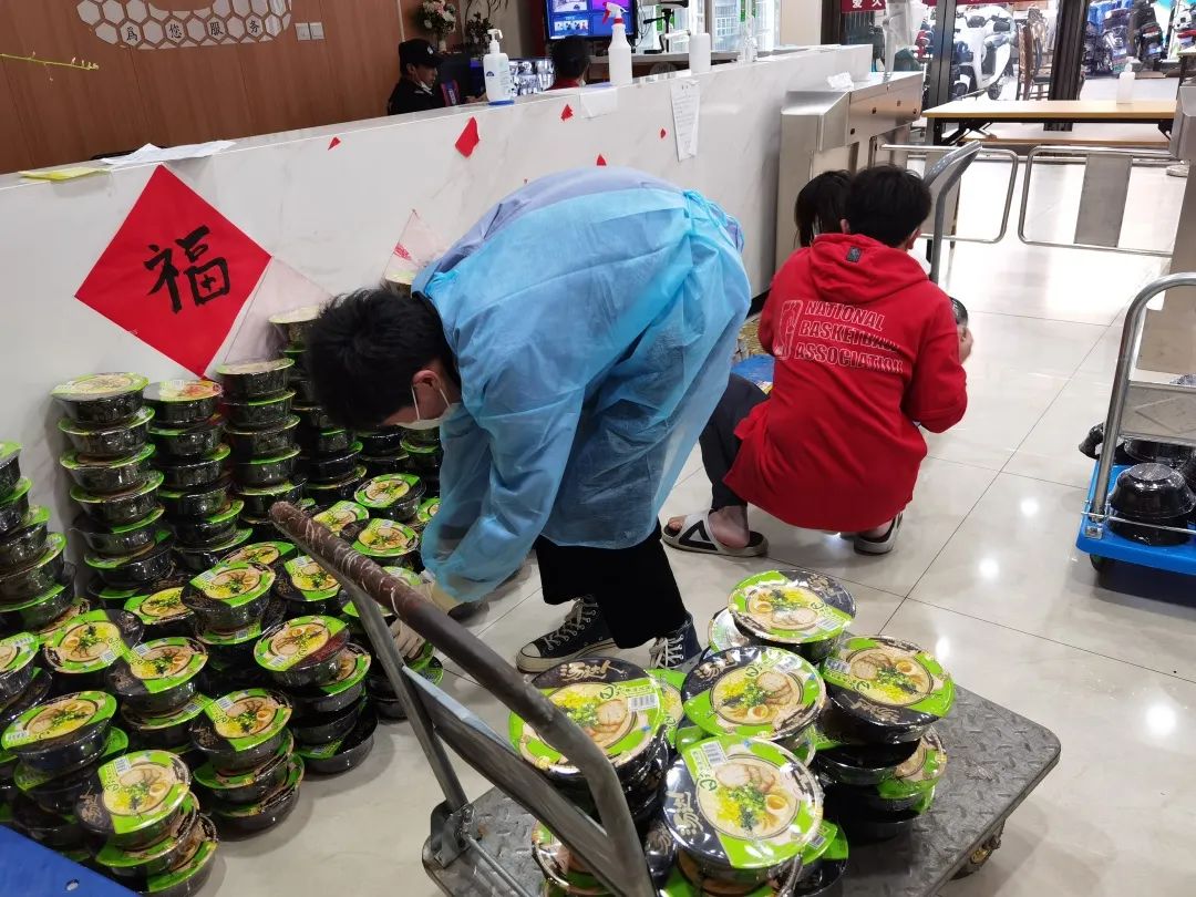 同一时间,爱久公寓的李瑞峰接到货车师傅的电话,学院老师联系购买、校友捐赠的一批物资到了。另一批志愿者马上投入工作,完成学院慰问物资的消杀、发放。自疫情以来,居住在爱久公寓的计算机学院学生共接收了4批物资,包括自热米饭、水果、牛奶、泡面等。