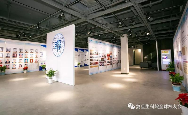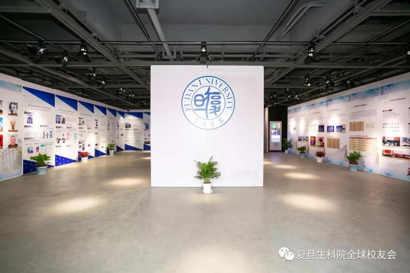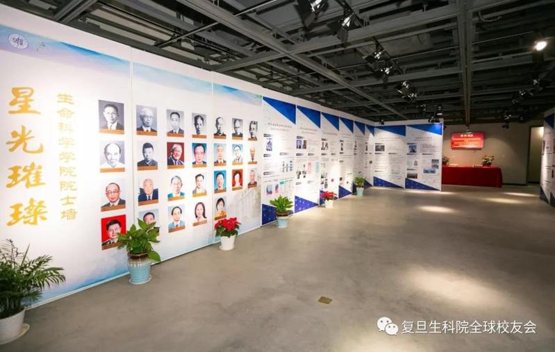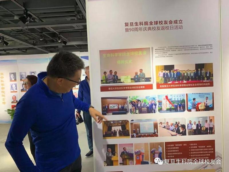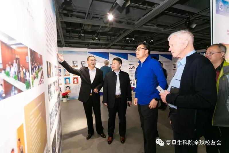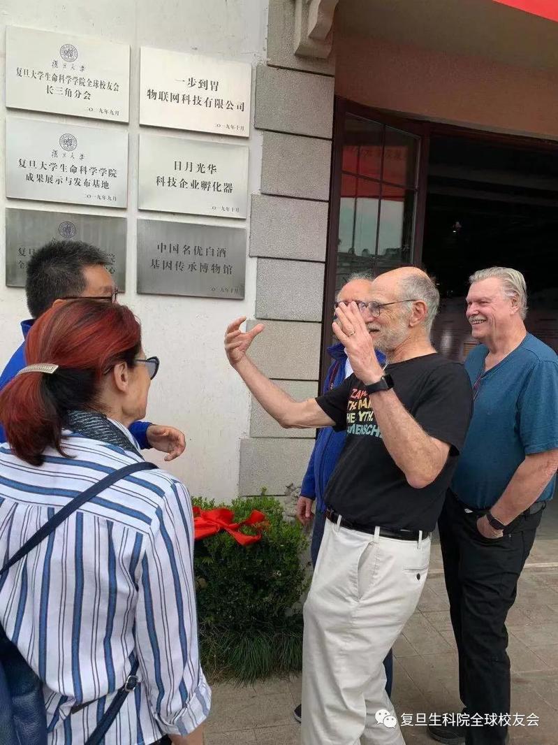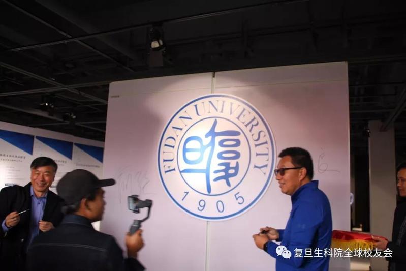 校友们和美国科学家们纷纷在复旦校徽墙上签名并集体留影。