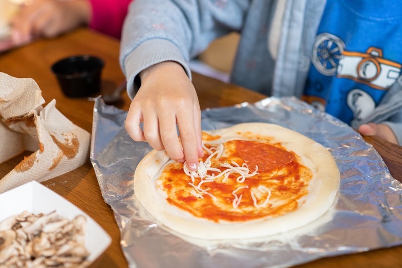 朋友们亲自动手做Pizza。小厨师们一个比一个认真。