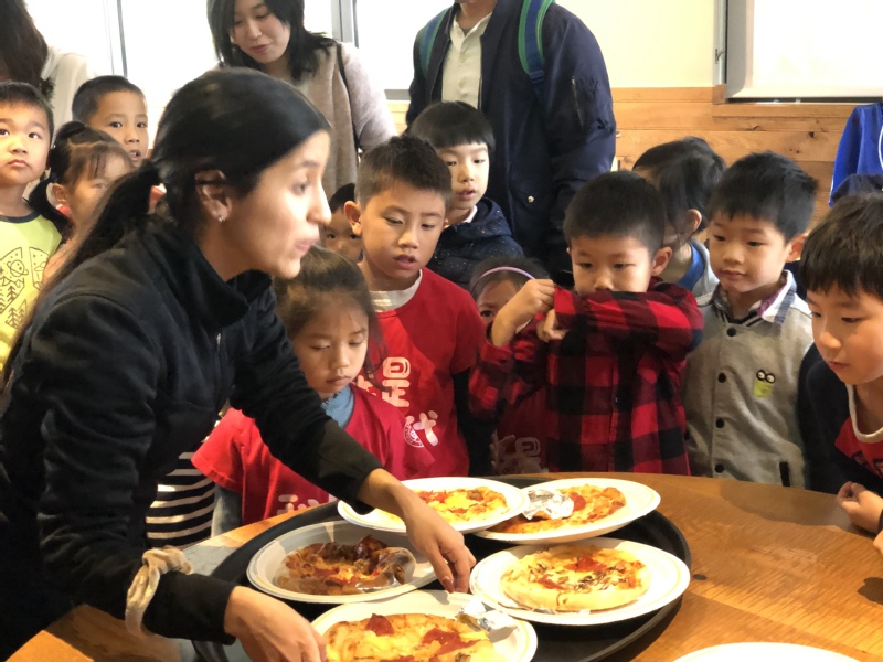 同时把近30个Pizza放进大烤箱,并均匀烤熟,可不是件容易的事。帮忙小朋友烤Pizza的可是有资格认证的专业Pizza厨师Juan Carlos阿姨。