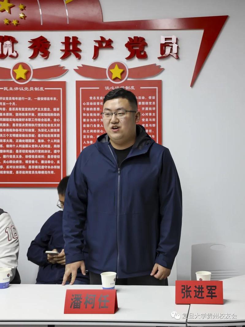 新校友代表姜蔚(2015级免疫学博士)、李霞(2015级基础医学博士)、鲍涛(2017级传播学硕士)、潘柯任(2017级电子信息科学与技术本科)、付春晨(2018级公共管理硕士)、宋海涛(2017级金融专硕 )等表示,感谢校友会组织的活动,希望入黔工作能在老校友的相关支持帮助下,助力贵州的发展,展现复旦人的风采。他们表示,加入校友会的大家庭很温暖,期望以后能和大家多交流,尽己所能为校友服务,同时祝愿校友会越来越好。