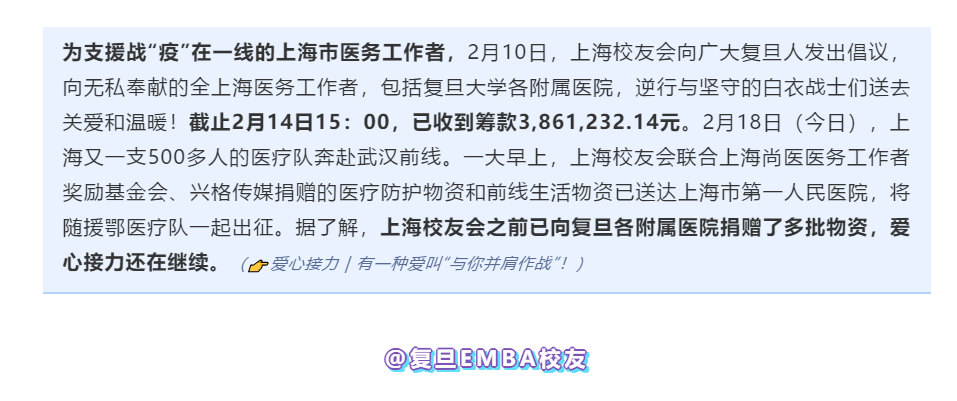 ▲ 2月18日,上海校友会联合上海尚医医务工作者奖励基金会、兴格传媒捐赠的医疗防护物资和前线生活物资送达上海市第一人民医院