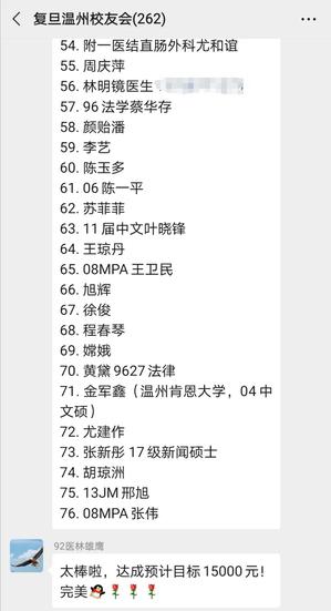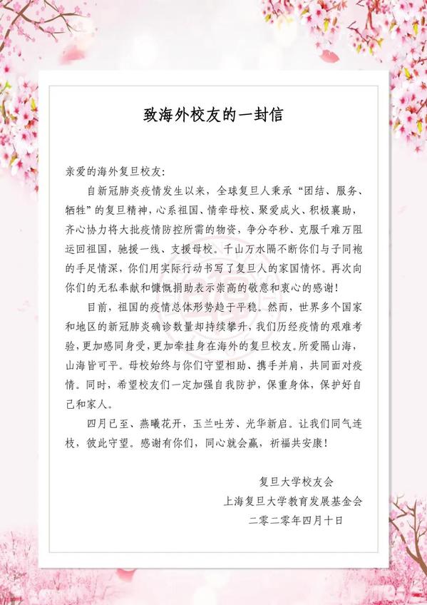 “邯郸枫林同窗谊,春风万里校友情。当祖国有需要,复旦海外校友心牵母校,送来温暖;现在海外校友遇到困难,母校送去思念、也送去真切的关爱。此次活动,我们校友有力出力、争作贡献;母校领导真诚用心、亲自关注每个细节。作为复旦校友大家庭的一员,我深感骄傲与自豪。”