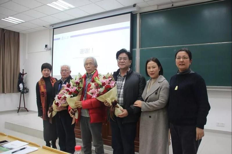 随后校友代表向刘欣、刘豪兴、范伟达、胡守钧和于海等几位老师献花,向老师们表达了校友们的感谢与祝福。