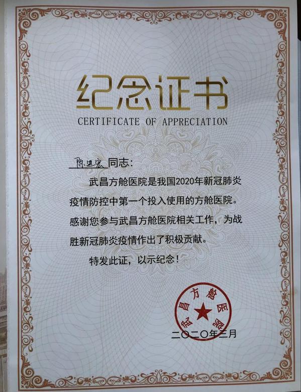 3月18日,华山医院第一批撤离队返回上海。陈进宏作为第一批撤离的队长,带领队员凯旋。返沪时,很多行李带不回来,但是他特意留下了三样值得珍藏的东西:武昌方舱医院的工作证、“党员之星”荣誉证书和当地百姓的感谢信。
