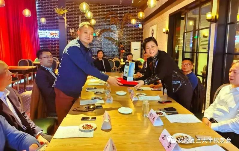 任红云会长接受夏立成会长赠送的带有复旦元素的定制礼品