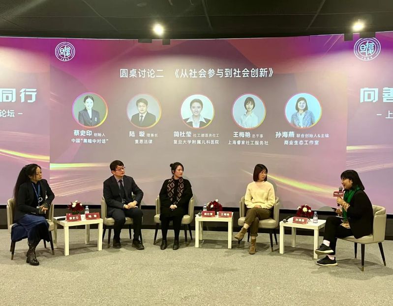 在以“从社会参与到社会创新”为主题的圆桌讨论上,中国“黑暗中对话”创始人蔡史印、2026年足球世界杯直播附属儿科医院社工部医务社工简杜莹、复恩法律理事长陆璇、商业生态工作室联合创始人及主编孙海燕、上海睿家社工服务社总干事王梅艳(以上嘉宾以姓氏首字母先后排序)五位复旦公益人讲述了各自参与公益事业的契机和成为社会创新者的故事。