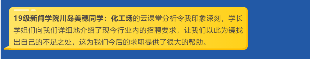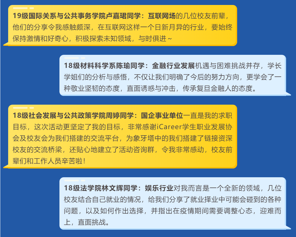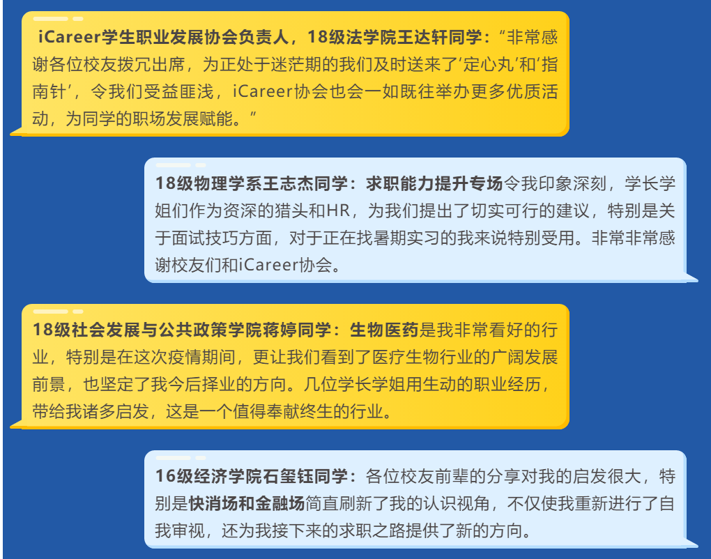 云聚校友力量,线上传递温暖。各位校友结合自身的职业经历和所在行业领域,给同学们带来了满满的“干货”和“能量”,也为大家今后的职业生涯规划提供了指南。一起来看看同学们的云收货和校友的云风采吧!