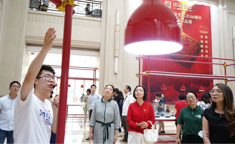 展览以时间为脉络,用300多枚印章记录并串联起中国共产党成立以来的重大事件,内容分为“新民主主义革命时期”、“社会主义革命和建设时期”、“改革开放和社会主义现代化建设时期”、“中国特色社会主义新时代”四大部分。参展的作者既有专业篆刻工作者,也有大中小学师生、企事业和科研单位职工等篆刻艺术爱好者,他们以多元的创新思维创作,除采用传统的石材、陶瓷、木材等印章用材外,还充分应用金属、树脂、亚克力、水晶、实木与金属漆、高铝耐火砖、玻璃微珠、玻璃纤维、石墨等新材料,并采用电脑设计、IPAD篆刻、机器刻制、3D 打印、彩色喷绘等新技术,使小小的印章呈现出丰富多样的式样、异彩纷呈,赋予了中国印文化和篆刻艺术更加丰富的新时代特征。