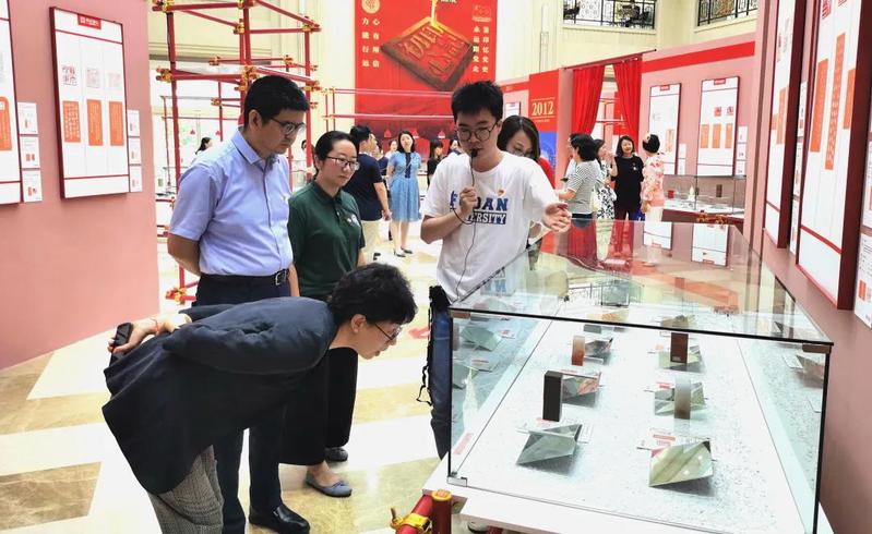 展览特辟“印记复旦”专区,由复旦师生创作设计了49枚主题印章。从这座由中国人自主创办的第一所大学建校时以“日月光华,旦复旦兮”中“复旦”二字命名,到陈望道老校长翻译首部《共产党宣言》中文全译本;从抗战时期内迁重庆北碚,青年学子在中共南方局的领导下积极参与社会活动,复旦因此有了“夏坝延安”的美誉,到1952年中国第一所国立大学医学院更名为“上海第一医学院”;从谭其骧团队历时31年完成传世之作《中国历史地图集》,到新世纪新一代复旦人用“中国芯”助力中国梦,用8年的不懈努力让“永平脱贫”,用心血和汗水留下“种子精神”……作品以时间为序讲述复旦百年校史。