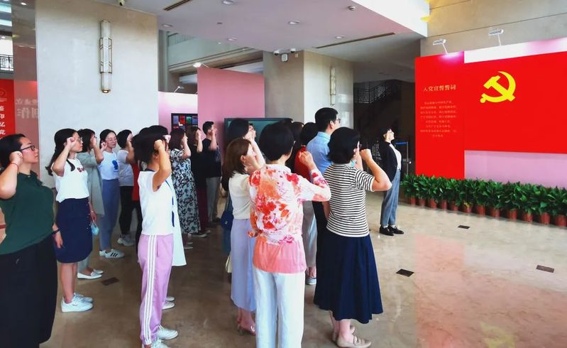 在展览现场,两个支部党员列队站在鲜红的党旗下,举行了重温入党誓词的活动。