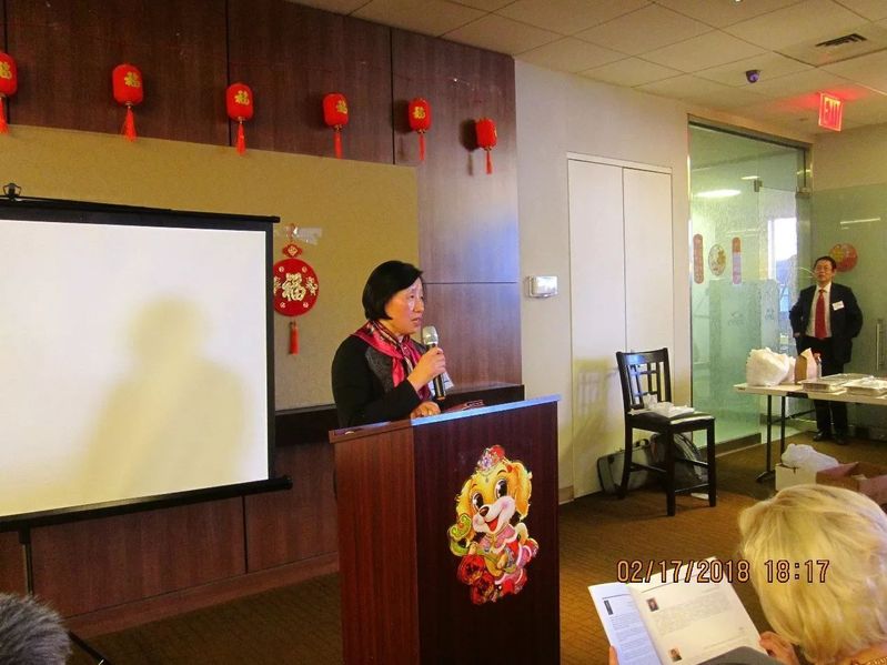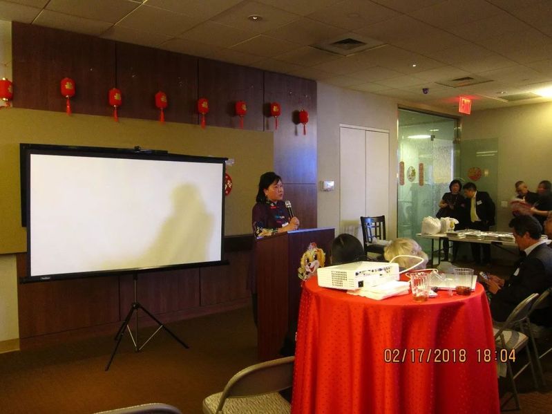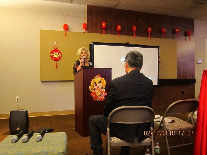 (从左至右:美国复旦校友企业家高管俱乐部顾问宋翔、美国复旦校友企业家高管俱乐部副会长卢菁、屈正哲、会长周谷声、副会长胡国祥、胡盛华以及纽约商会会长Cynthia)