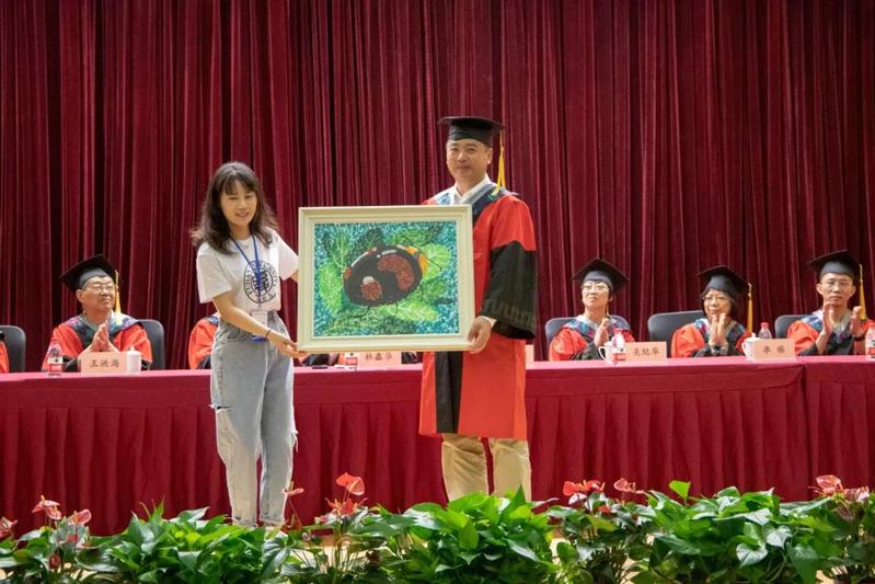 2019届本科毕业生雷天浩介绍到:画板上的异色瓢虫是毕业生们一个手印一个手印拼合而成的,既为了纪念学院创始人谈家桢先生,也体现了毕业生对母校、对学院的恋恋不舍。院党委书记陈浩明老师接受了毕业生礼物,并向毕业生表示感谢。
