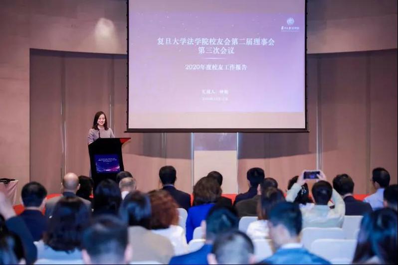 法学院党委副书记钟妮向大会作校友会2020年年度校友工作报告。钟妮围绕主动作为,打响复旦法律人抗“疫”阻击战;拓展资源,多渠道帮助毕业生度过“最难就业季”;夯实基础,不断健全校友会自身建设;创新形式、灵活开展疫情下各类校友活动;凝心聚力,助力学院事业发展新突破等五个部分汇报了年初至今校友会的重点工作与主要成绩。