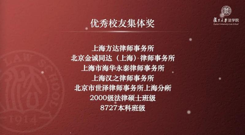 上海市律师协会会长、方达律师事务所合伙人季诺(1992届本科、1998届法学硕士),融力天闻律师事务所高级合伙人刘赤军(2006届在职法硕)作为获奖代表先后发表精彩获奖感言。