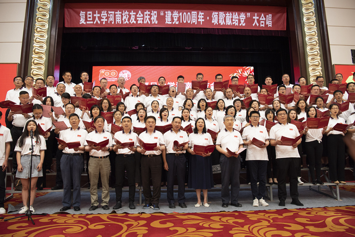 在“颂歌献给党,校友大合唱”环节,许征副书记、张一华副会长、徐明稚副会长、杨增国处长与近百位河南校友们共同唱响《唱支山歌给党听》《我爱你中国》《没有共产党就没有新中国》等三首经典歌曲。饱满的热情、嘹亮的歌声,将现场气氛推向高潮,振奋人心。把颂歌献给党,河南复旦校友共同为中国共产党建党100周年献礼。