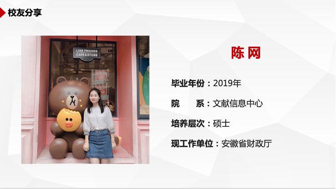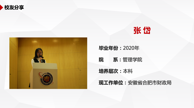 张岱校友首先向同学们介绍了安徽省选调的历史和最新的政策,接着对安徽选调的考情进行了回顾和分析,最后张岱校友分享了她参加工作以来详细的工作内容和切身感受,她表示在基层得到了很大的锻炼和提升,也鼓励大家投身基层,为祖国和人民作贡献。