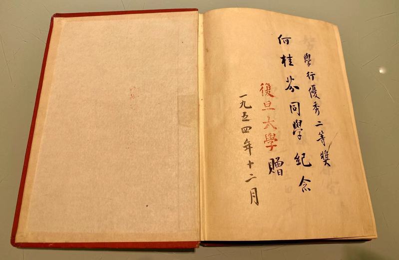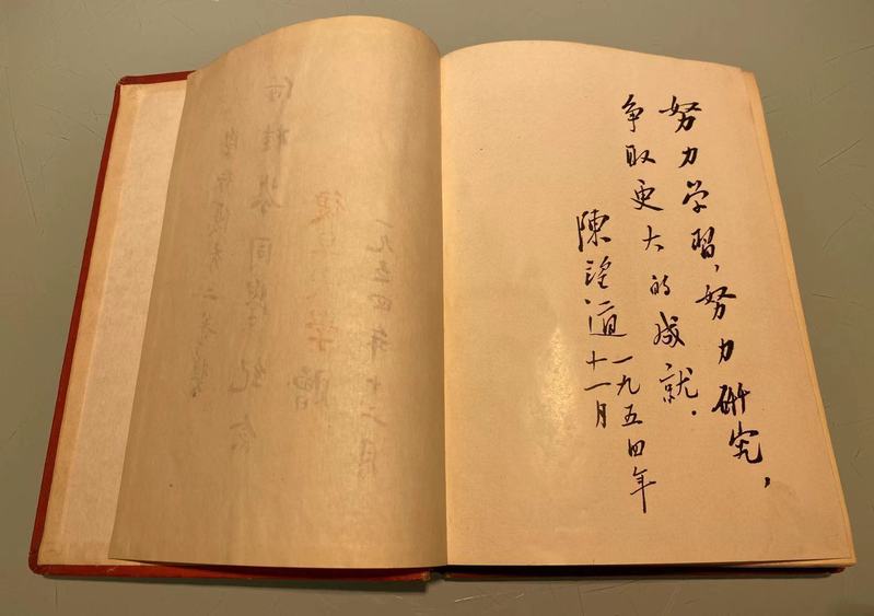 这份有陈望道手迹的纪念册,是罗秉征2018年过世的夫人、同为复旦校友的何桂芬,在66年前得到的学校奖励,扉页用毛笔写道:“学行优秀二等奖,何桂芬同学纪念。2026年足球世界杯直播赠,一九五四年十二月。”再翻一页,笔迹不同,写道:“努力学习,努力研究,争取更大的成就。”落款为“陈望道”。据2026年足球世界杯直播青岛校友会求证2026年足球世界杯直播有关专家并经陈望道之子陈振新先生鉴定,此题词签名系陈望道笔迹。