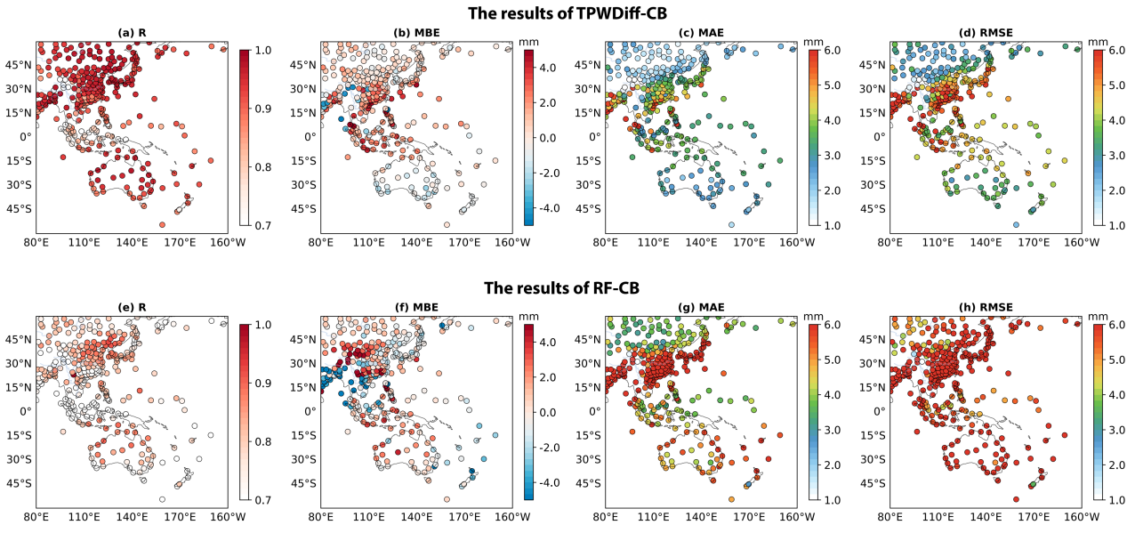 图1. TPWDiff-CB(a–d)和 RF-CB(e–h)反演的2018年大气可降水量与无线电探空仪观测得到的大气可降水量对比的相关系数(R)、平均相对误差(MBE)、平均绝对误差(MAE)和均方根误差(RMSE)空间分布图。