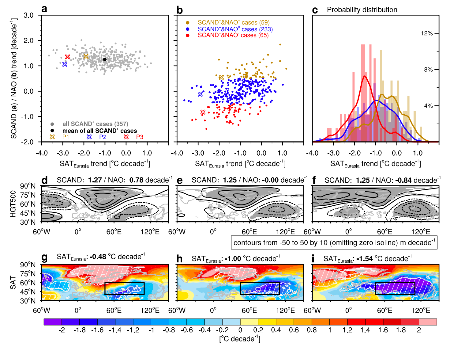 图2|SCAND和NAO在欧亚年代际降温中的协同作用。图a(图b)是所有SCAND+事件中欧亚地表气温及SCAND(NAO)指数的变化趋势。根据NAO趋势把所有SCAND+事件分为三类:SCAND+&NAO+(黄色)、SCAND+&NAO0(蓝色)和SCAND+&NAO-(红色)。图c为三类事件对应的欧亚气温变化趋势的概率密度分布。图d-f(图g-i)为三类事件合成得到的500hPa位势高度(地表气温)线性趋势的空间分布。