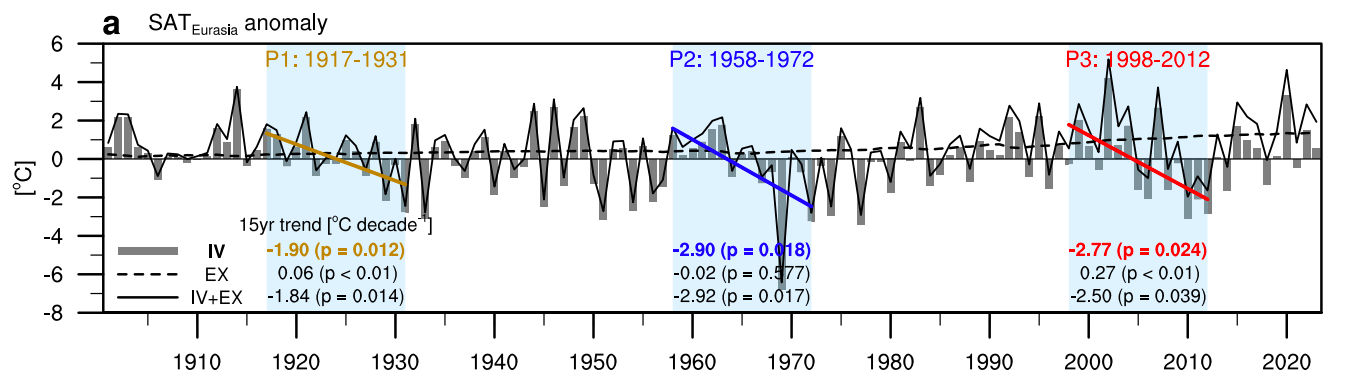 图1|1900年以来欧亚大陆出现的三次显著冬季年代际降温事件:P1(1917-1931)、P2(1958-1972)、P3(1998-2012)。欧亚大陆冬季地表气温异常的逐年演变(黑实线),及其分解出来的外部强迫(黑虚线)和内部变率(灰柱)分量(单位:摄氏度)。此外,下方给出三个时期的降温幅度(单位:摄氏度/十年)。