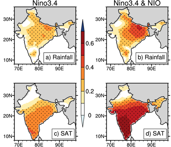 图2. 印度夏季逐月降水和表面气温与同期Niño-3.4和北印度洋(NIO) SST的相关关系的空间分布。